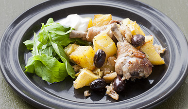 Put the potatoes, drumsticks, oil, garlic, oregano, lemon and olives into a large roasting dish.